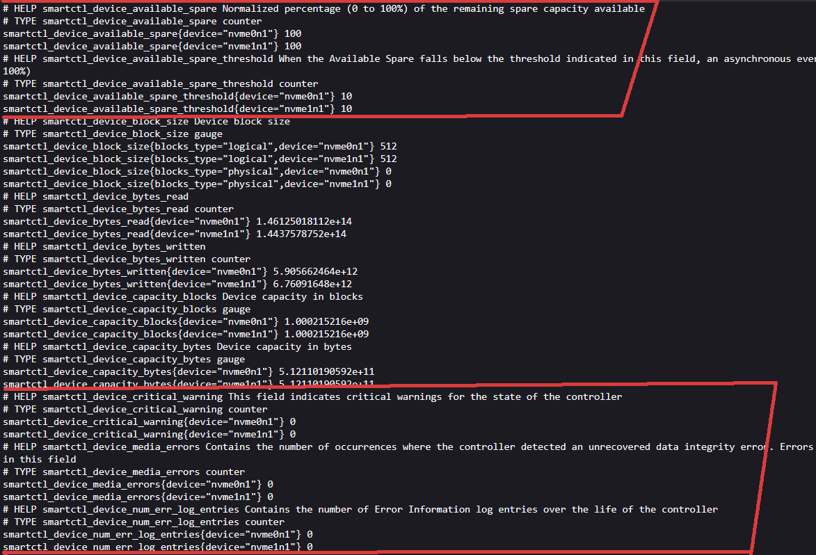 Available Spare and Available Spare Threshold — represent the remaining reserve capacity of the drive. An alert should be triggered when Available Spare falls below the threshold.