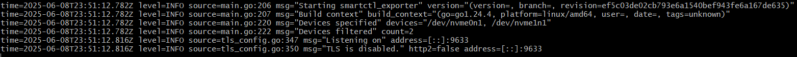 In this article, smartctl_exporter is exposed on 0.0.0.0:9633 without TLS or authentication for simplicity and demo purposes.