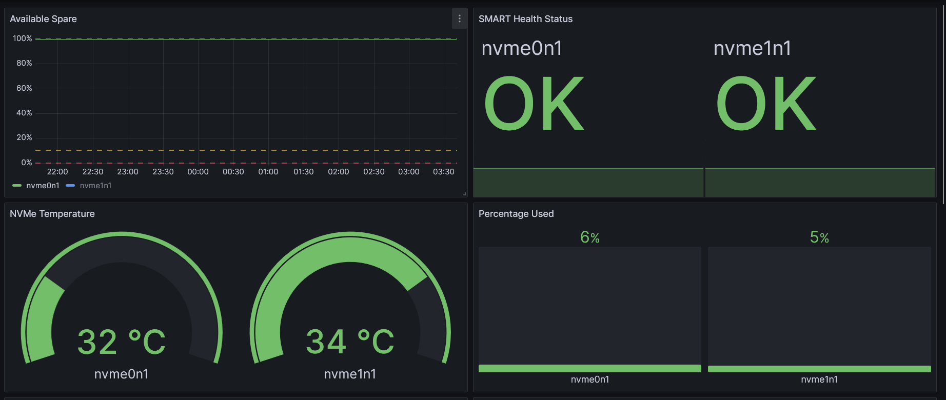To visualize the health and usage of your SSDs, you can create a custom Grafana dashboard with the following panels. These metrics are collected using the smartctl-exporter and exposed to Prometheus.